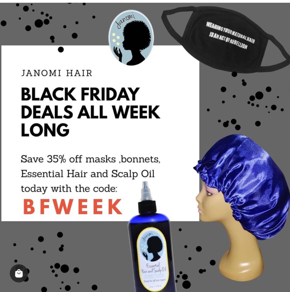 3. Janomi – my go to hair oil! Leaves your scalp feeling so fresh! And their big hair bonnets are perfect for protective hair styles.